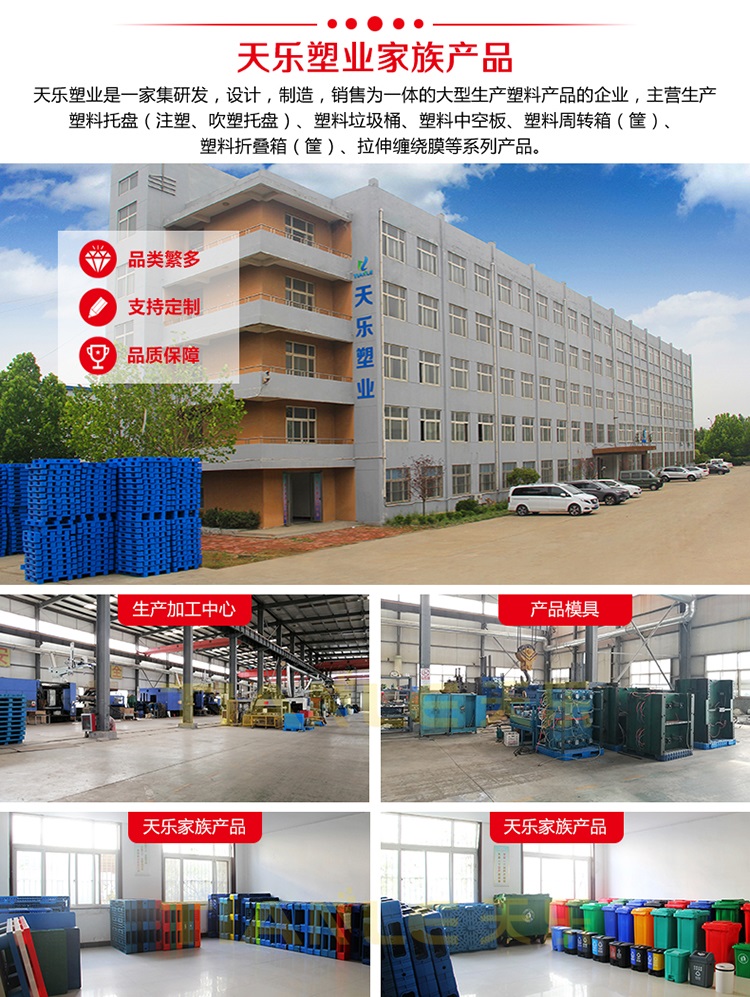 天樂塑業(yè)是一家集研發(fā),設(shè)計(jì),生產(chǎn),銷售為一體的大型塑料制品的企業(yè),公司擁有大型注塑吹塑設(shè)備、托盤焊接設(shè)備十多臺,截止目前產(chǎn)品模具多達(dá)七八十種,產(chǎn)品規(guī)格品類繁多,公司擁有經(jīng)驗(yàn)豐富的設(shè)計(jì)研發(fā)人才、設(shè)備維保技師,可提供產(chǎn)品顏色、重量、logo等定制服務(wù)、代加工服務(wù)。公司主營生產(chǎn):塑料托盤、塑料垃圾桶、塑料周轉(zhuǎn)箱(筐)、塑料折疊箱、PP中空板、拉伸纏繞膜等系列產(chǎn)品。